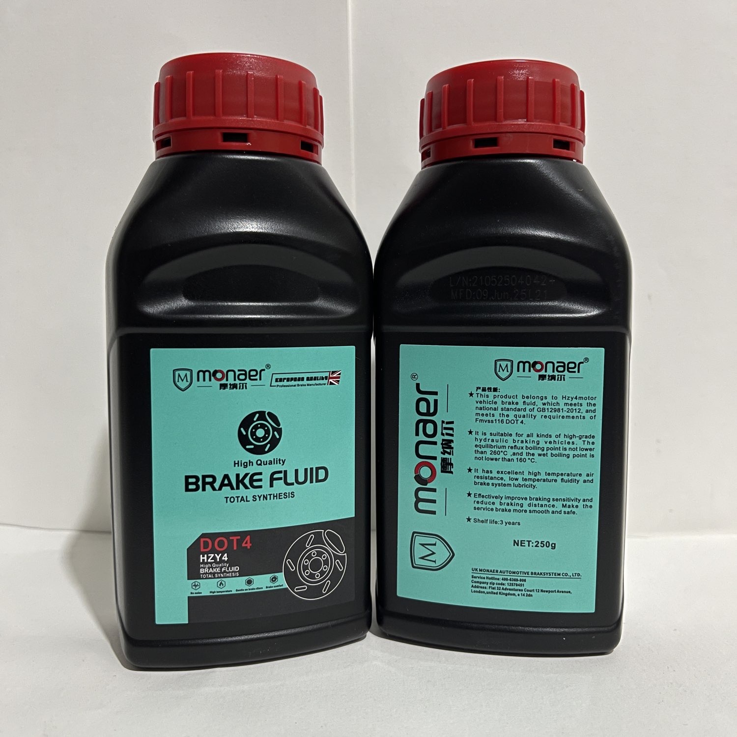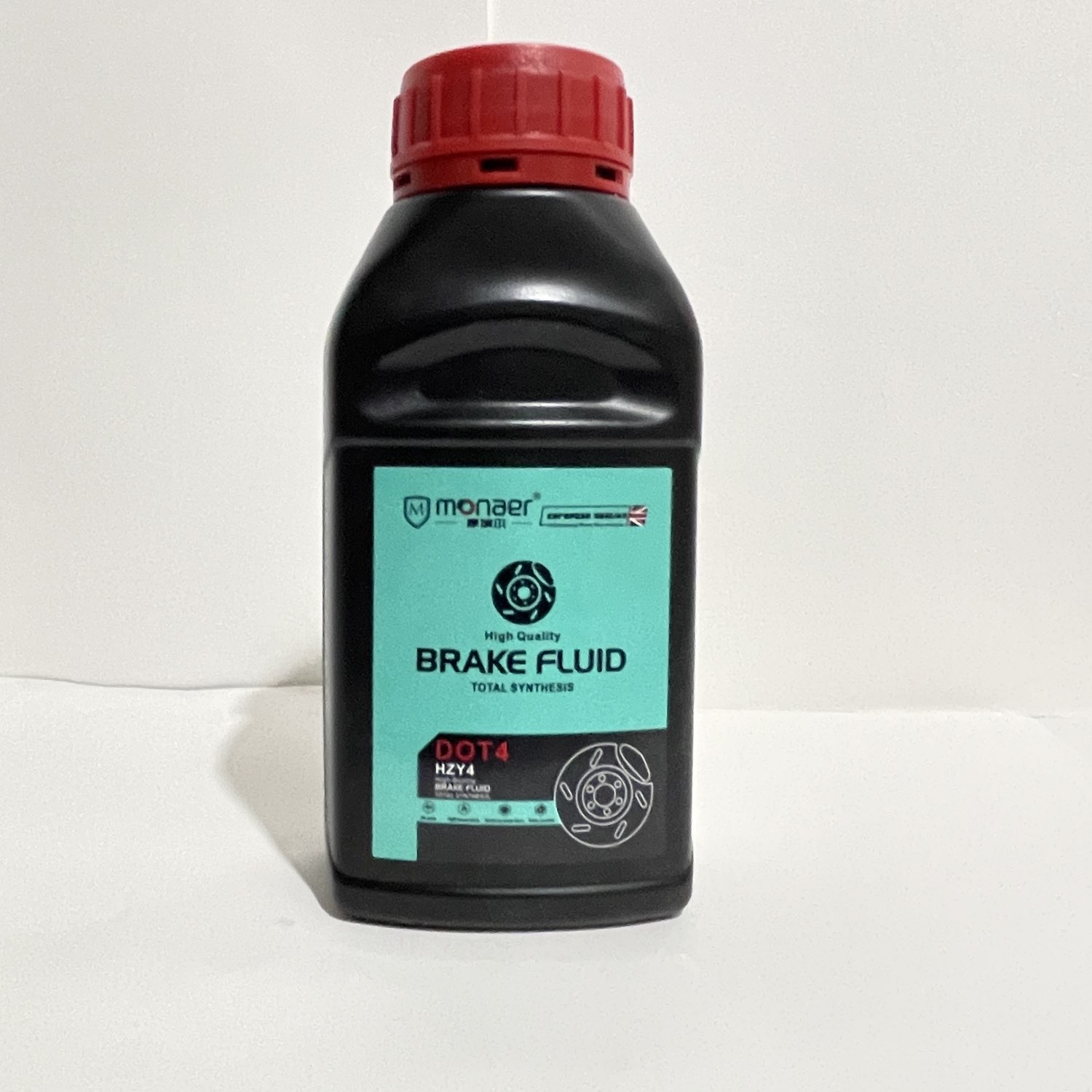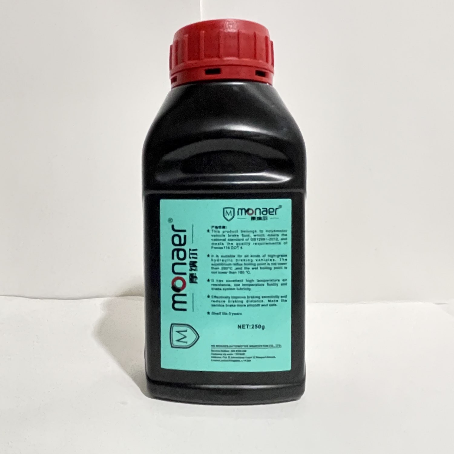 Monae dot4 brake fluid. Quality that assures performance and effectiveness of your braking system. Total syntheses recommended for all kinds of high-grade hydraulic braking vehicles. It has excellent high temperature air resistance, low temperature fluidity and brake system lubricity.