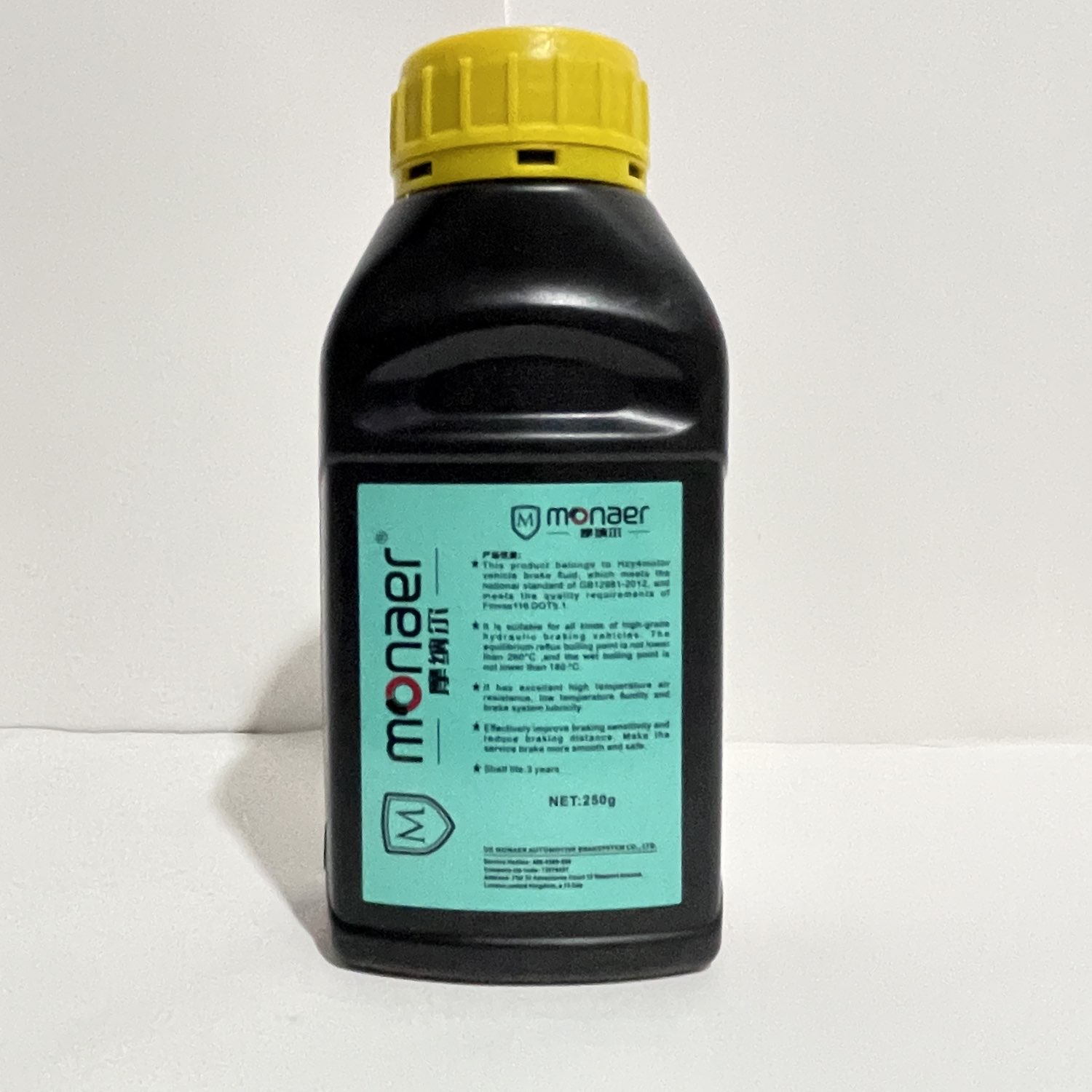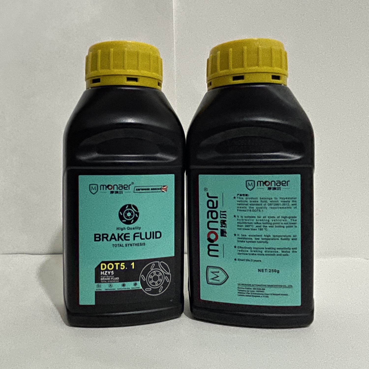 Monaer high quality brake fluid, dot 5.1, total synthesis. Quality that assures performance and effectiveness of your braking system. Total syntheses recommended for all kinds of high-grade hydraulic braking vehicles. It has excellent high temperature air resistance, low temperature fluidity and brake system lubricity.